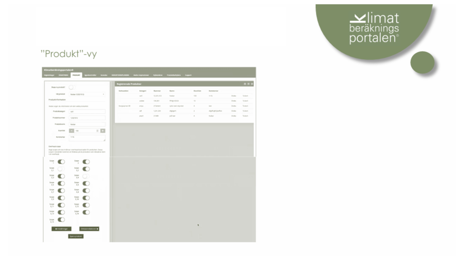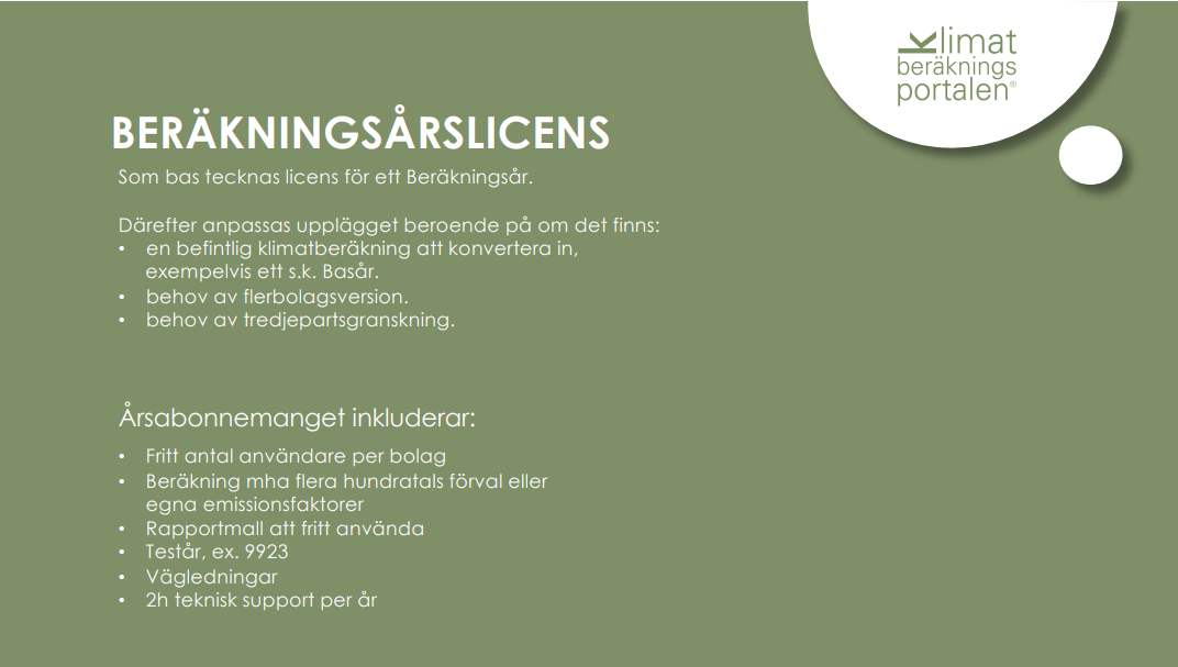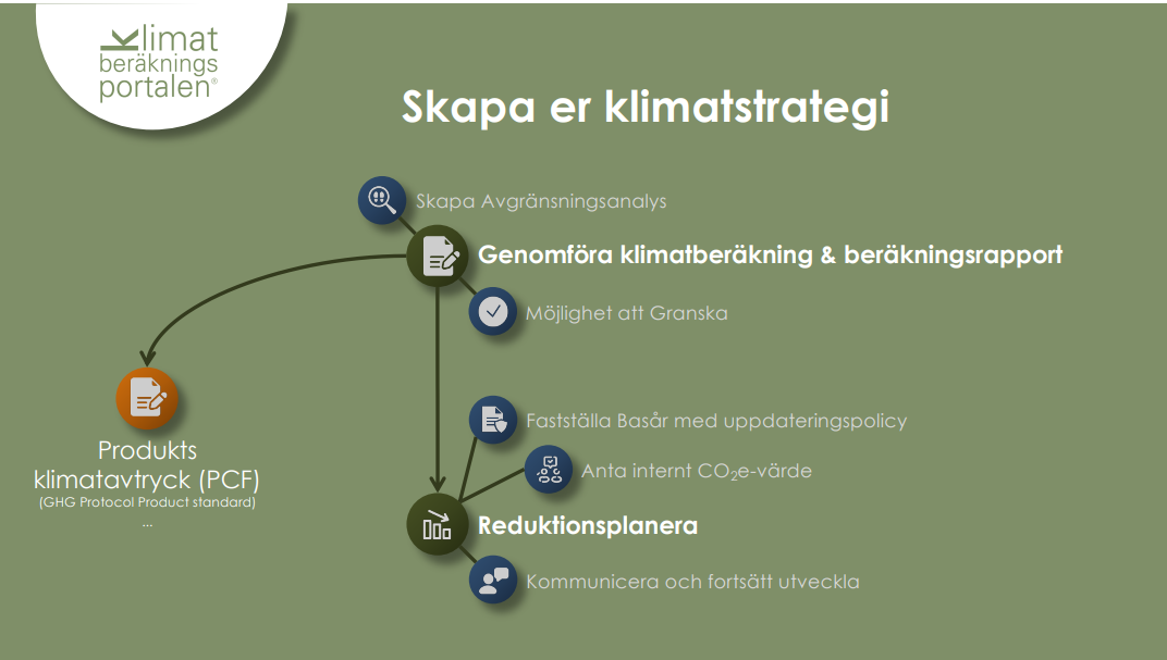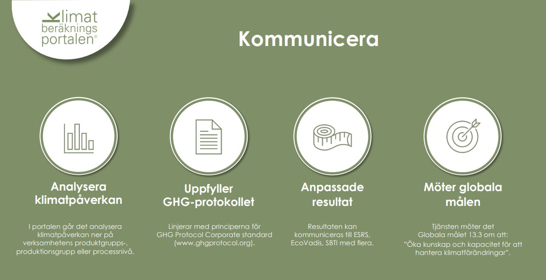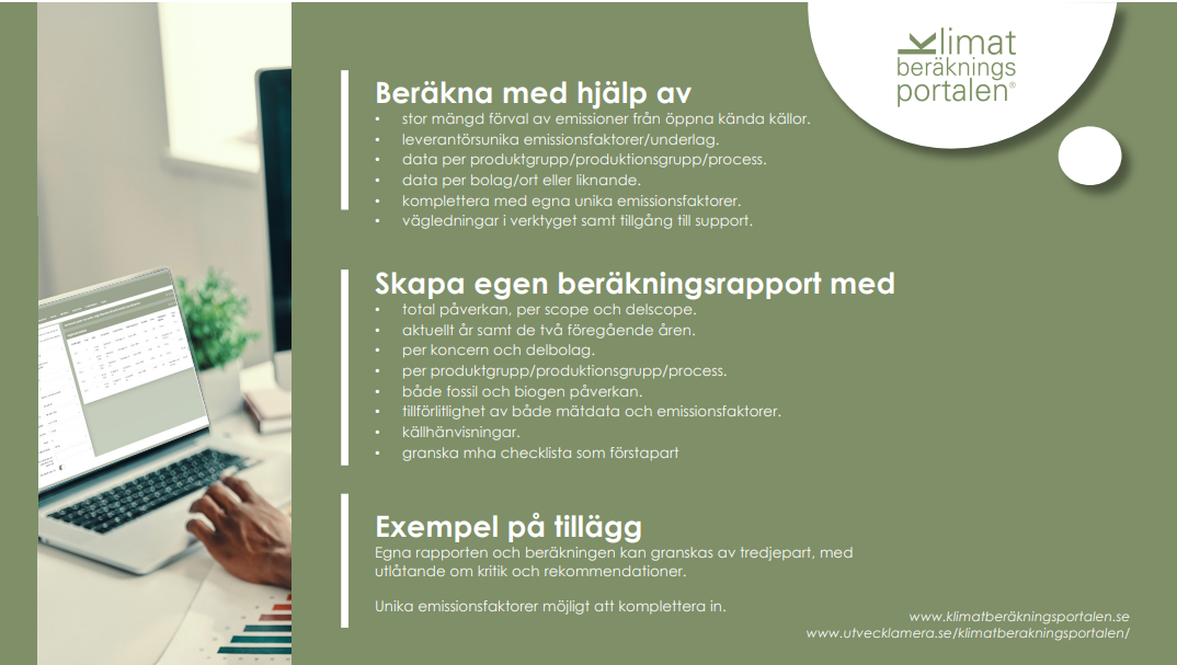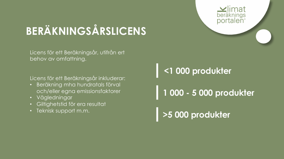 Med Klimatberäkningsportalen® vill vi stötta små- och medelstora företag att hantera sitt klimatavtryck. Vårt klimatberäkningsverktyg är effektivt och enkelt att använda och går att anpassa för att beräkna företagets såväl som enskilda produkters CO2e-värde.